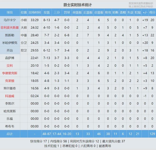 北京时间10月23日,NBA常规赛:爵士主场129-108大胜快船。四节比分(爵士在前):43-19、35-28、30-33、21-28。爵士最多领先37分,整个下半场都是垃圾时间。上赛季爵士17胜65负西部垫底,本赛季揭幕战打爆快船。