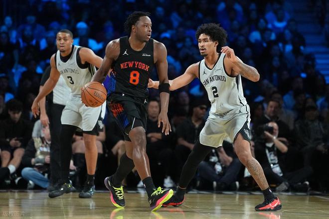 比赛回归:首节比赛便火花四溅。尼克斯这边明确主攻方向,布伦森与阿奴诺比扛起进攻大旗,两人合力砍下 19 分,包揽球队首节 28 分中的绝大部分;马刺则延续多点开花的风格,首节 9 人轮换中有 7 人斩获得分,在胶着的拉锯战中以 2 分优势领先结束首节。次节战局依旧胶着,马刺虽未能拉开分差,但始终稳稳掌控领先优势。尼克斯进攻端依旧依赖布伦森与阿奴诺比的双核驱动,全力追分;马刺则持续多点发力,共有6人得分上 6,带着 2 分领先优势进入下半场。