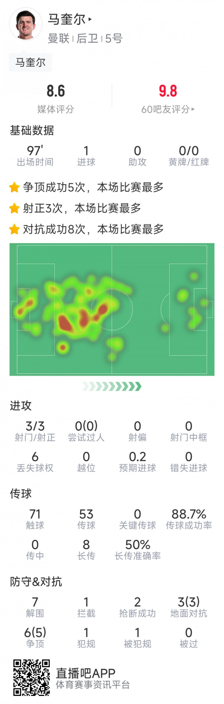战神!马奎尔本场数据:1粒进球,3次射正,7次解围,2抢断