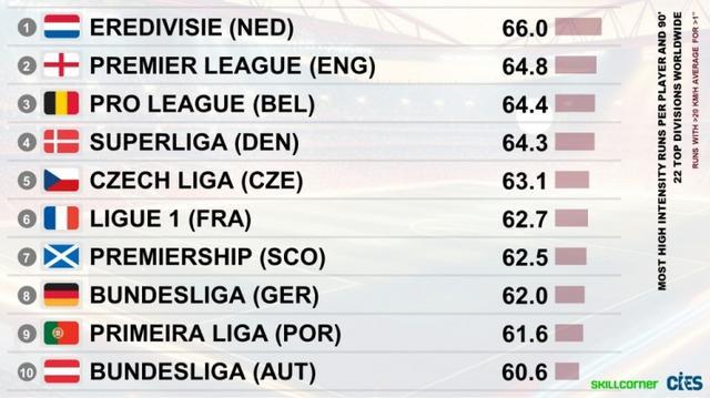 各联赛球员平均高强度跑动数据对比:荷甲第一,英超第二比甲第三
