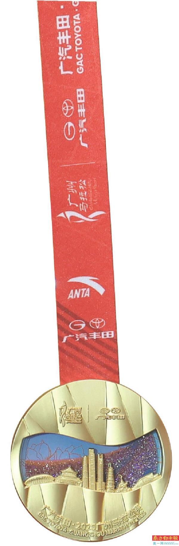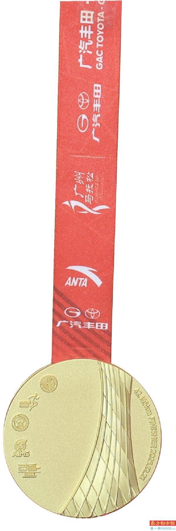 今年广马完赛奖牌以“珠江水韵”为设计灵感,奖牌正面巧妙融入流沙工艺,将广州建筑群镌刻于灵动水波之上,生动呈现城市奔涌向前的发展动能与深厚绵长的历史底蕴;背面则以立体线条勾勒广州塔,以挺拔向上的视觉意象,呼应跑者挑战自我、突破极限的精神内核。