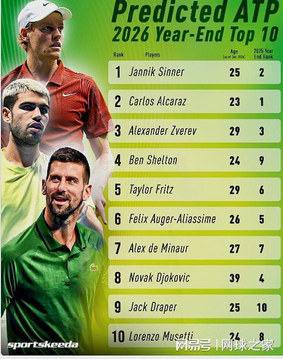 预测的其他年终前十球员和今年的基本一致,只是排名稍有变动。今年的世界第五阿利亚西姆下滑一名,排在第六;今年的世界第六弗里茨上升一位,排在第五;世界第七德米纳尔保持不变;世界第八穆塞蒂下滑两名,退居第十位;世界第十德雷珀则是上升一名,位列第九。对于外媒的这个预测榜单,您认同吗?您觉得还有哪位球员能在2026赛季冲进年终TOP10呢?欢迎留下您的高见。