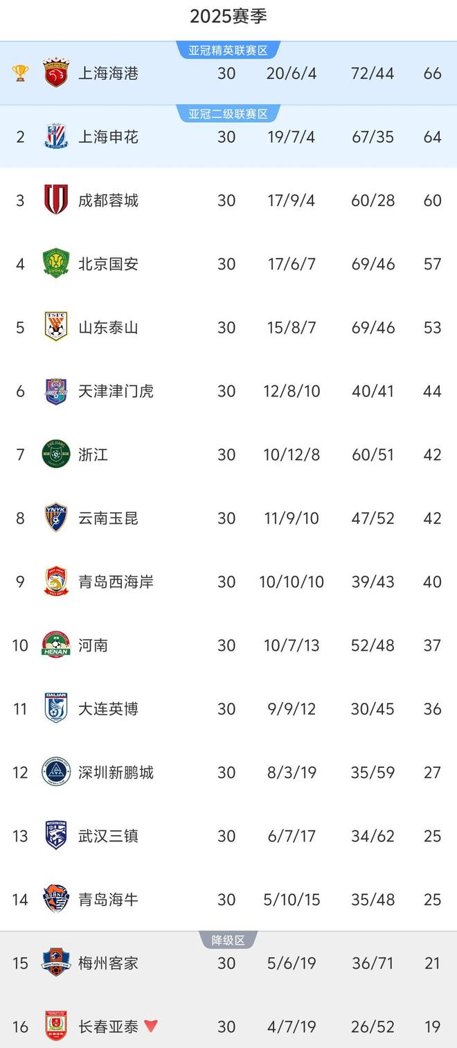 北京时间11月22日,随着最后一轮联赛8场同时开赛的比赛顺利进行,2025赛季中超联赛就此结束。30轮完整积分榜,上海海港领先上海申花2分,以绝对优势实现联赛三连冠。保级方面保级线降至25分,青岛海牛锁定最后一个保级名额,梅州客家成为长春亚泰之后第二支降级球队。