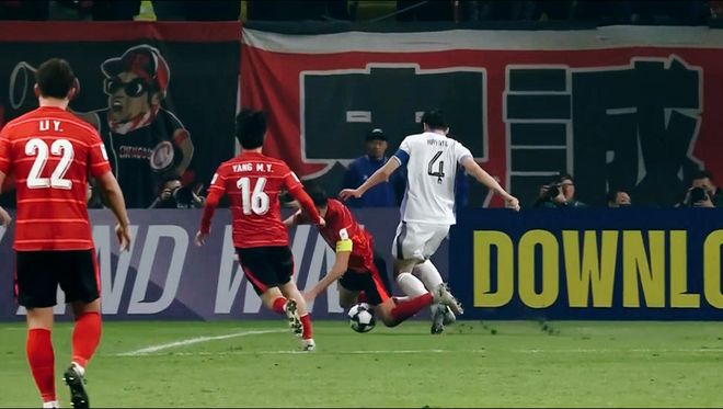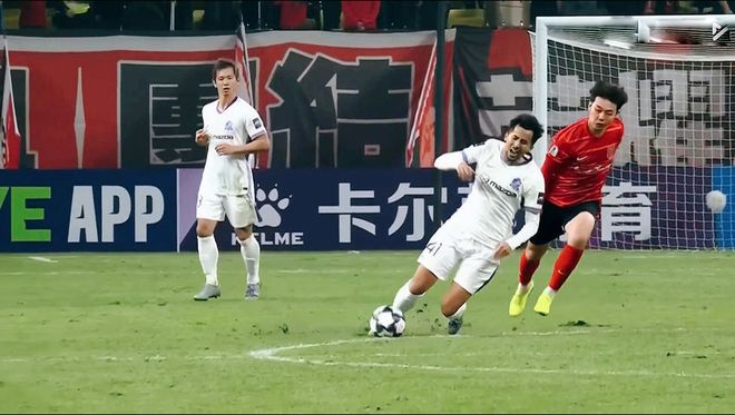 下半场回来,仅仅一分钟,对手利用边线球的机会,禁区连续形成颇具威胁的射门,幸亏蹇韬注意力高度集中,力保球门不失!第50分钟,禁区内周定洋被荒木隼人推倒,裁判果断吹罚点球,费利佩一蹴而就,1:0!
